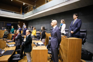 En señal de duelo, se pide que ondeen a media asta las banderas de Europa, España y Navarra en la fachada principal y lugares oficiales de la Cámara