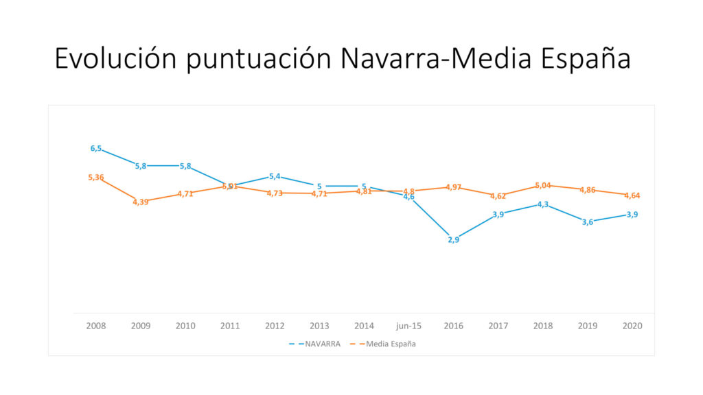 A partir de esa fecha, explica, “Navarra siempre ha obtenido peores notas que la media española, según se ha ido relatando en los diversos dictámenes: En 2016, la nota de Navarra fue de 2,9 y la media española de 4,97; en 2018, la nota de Navarra fue de 4,3 y la media española de 5,04; y en 2020, la nota navarra ha sido de 3,9 y la media española de 4,64”.
